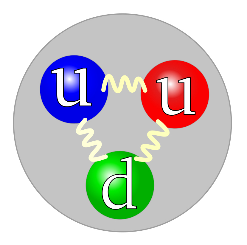 According to the 1973 theory, a proton, for example, is a bound state of three coloured quarks, one red, one blue and one green, two of which have electric charges +2/3, and one of which has an electric charge of -1/3, as shown in Figure 10.