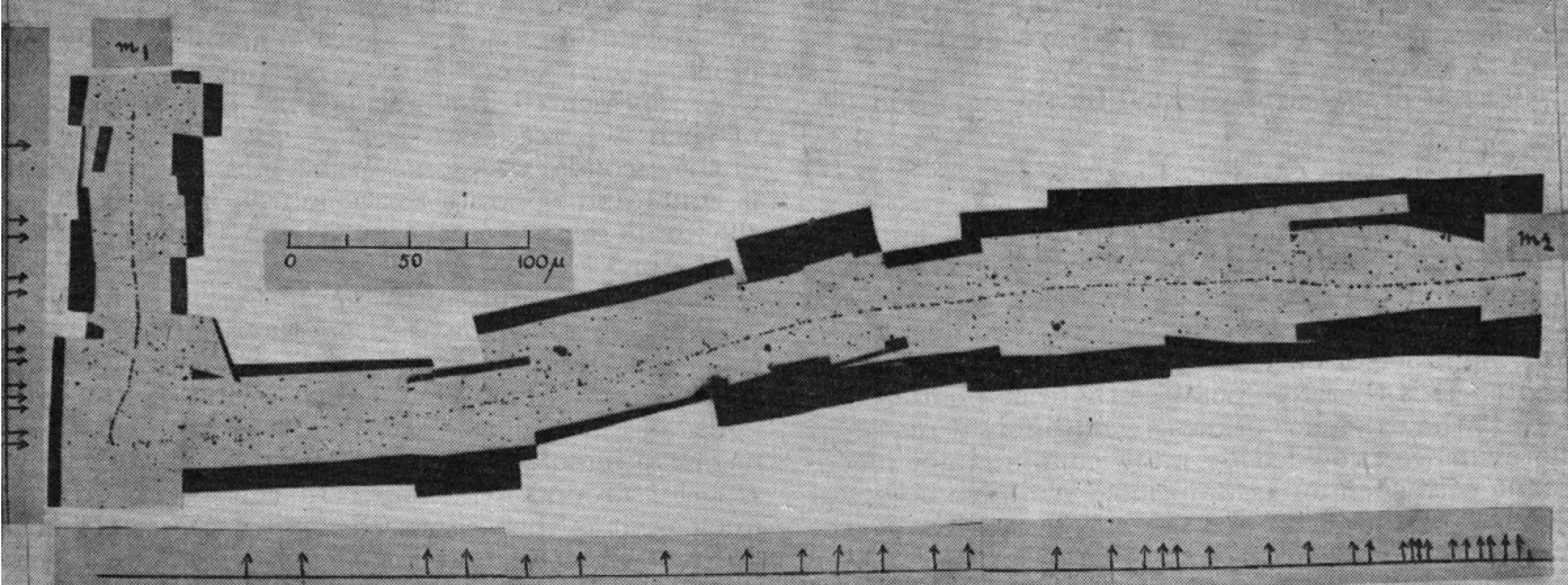 In 1936, eleven years before Powell found the pion, Carl Anderson of California found another unstable, radioactive particle (lifetime about 10-6 sec) in the cosmic radiation9. Anderson’s particle was only slightly lighter than the pion, and at first it was thought it might be Yukawa’s predicted particle. However, it was found that Anderson’s particle did not interact strongly with matter, and that therefore it could not be the particle predicted by Yukawa. Anderson’s particle was later dubbed the “muon” or µ.